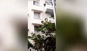 Un enfant est suspendu dans le vide, à l'extérieur d'un balcon, au 4e étage d'un immeuble d'habitations.